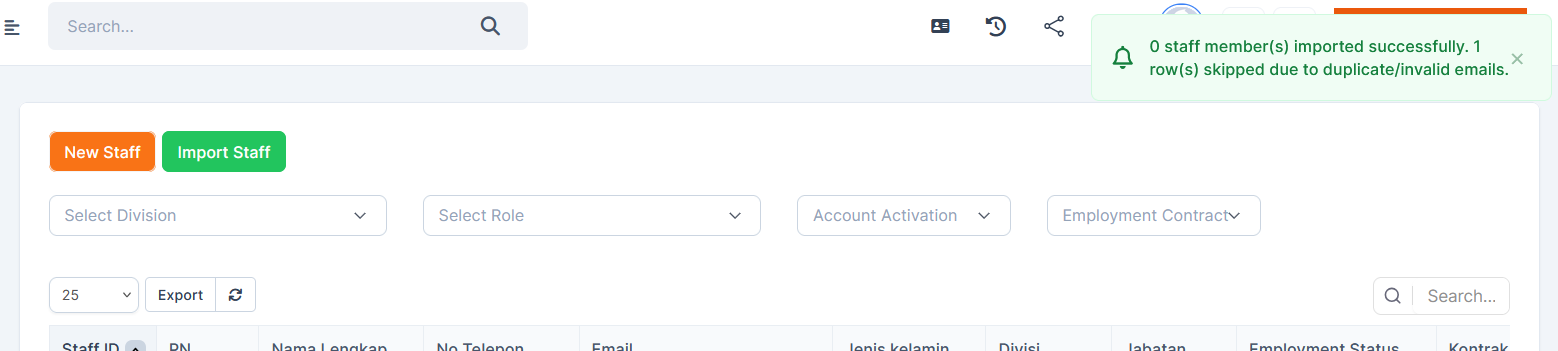 Import Staff pada HRM Staff digunakan untuk memasukkan data staff dalam jumlah besar secara massal ke dalam sistem Bee-RP. Berikut adalah langkah-langkahnya: