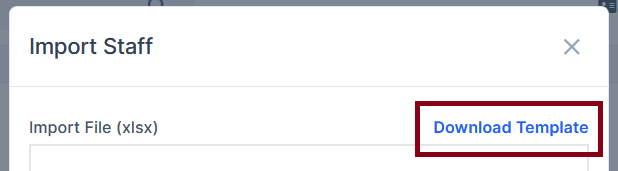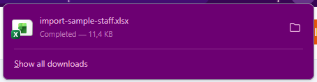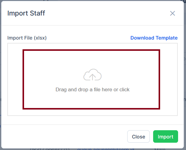 - Kembali ke Import Staff, upload excel yang sudah diisi dengan cara klik tombol disini: