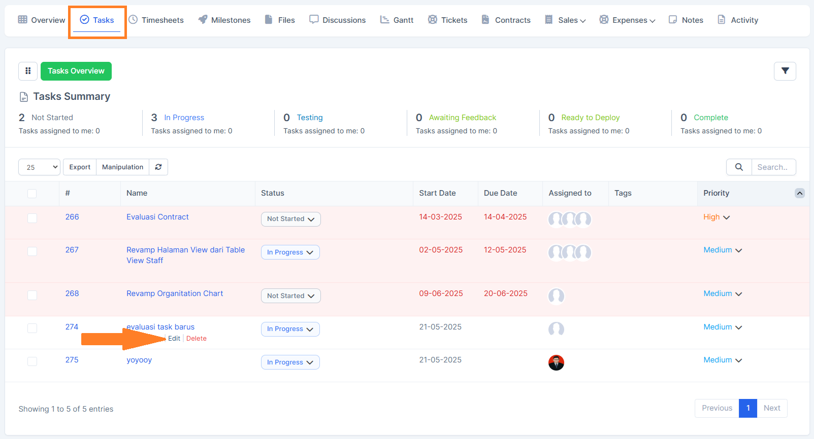 - Hover ke task yang akan di edit, lalu klik tombol Edit