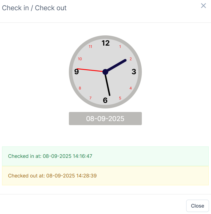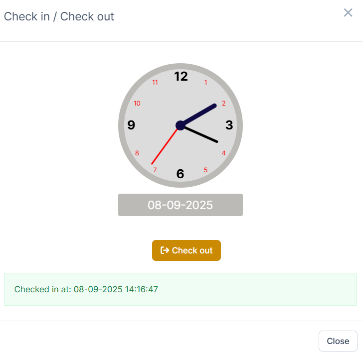 Waktu kerja telah selesai, tercatat di Checked out at.
