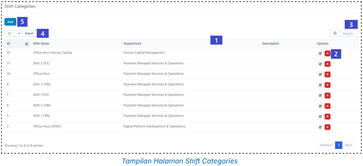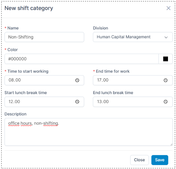 Shift Categories digunakan untuk manajemen jadwal waktu kerja pada divisi Anda, seperti office hour dan shifting.