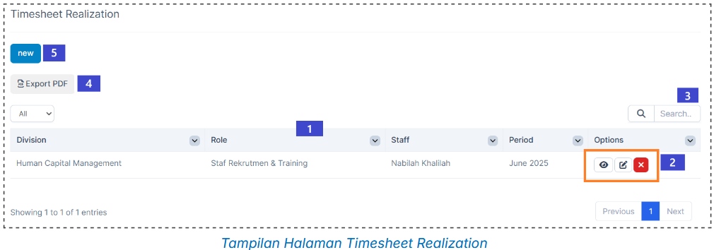 Pada halaman Timesheet Realization, sistem menampilkan: