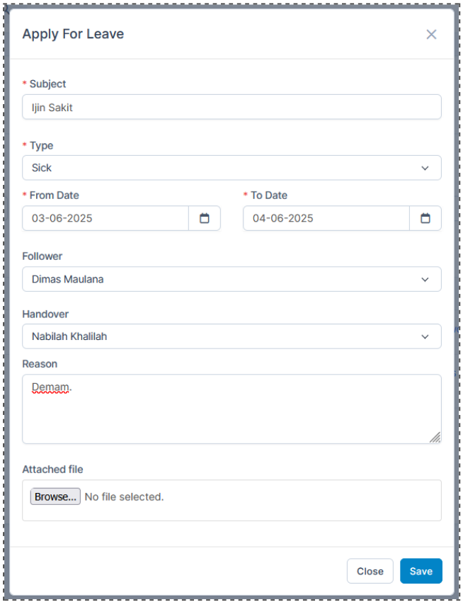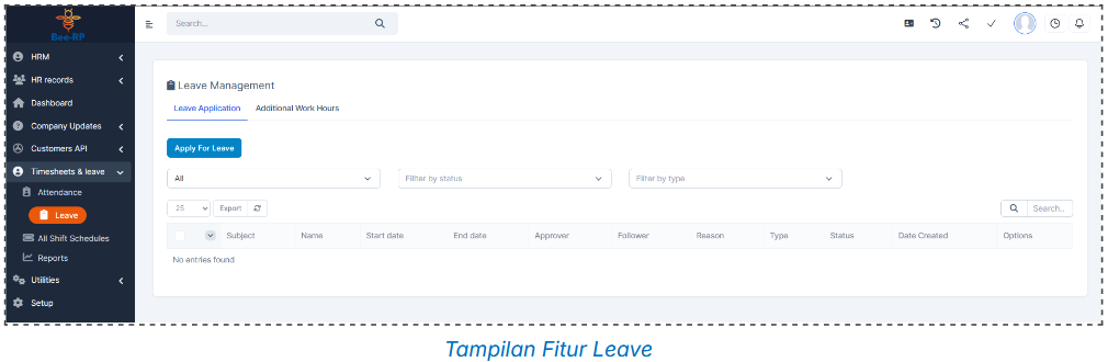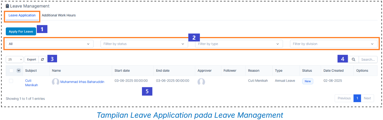 Leave Application digunakan untuk manajemen cuti. Terdapat beberapa fitur yang ada di Leave Application, yaitu: