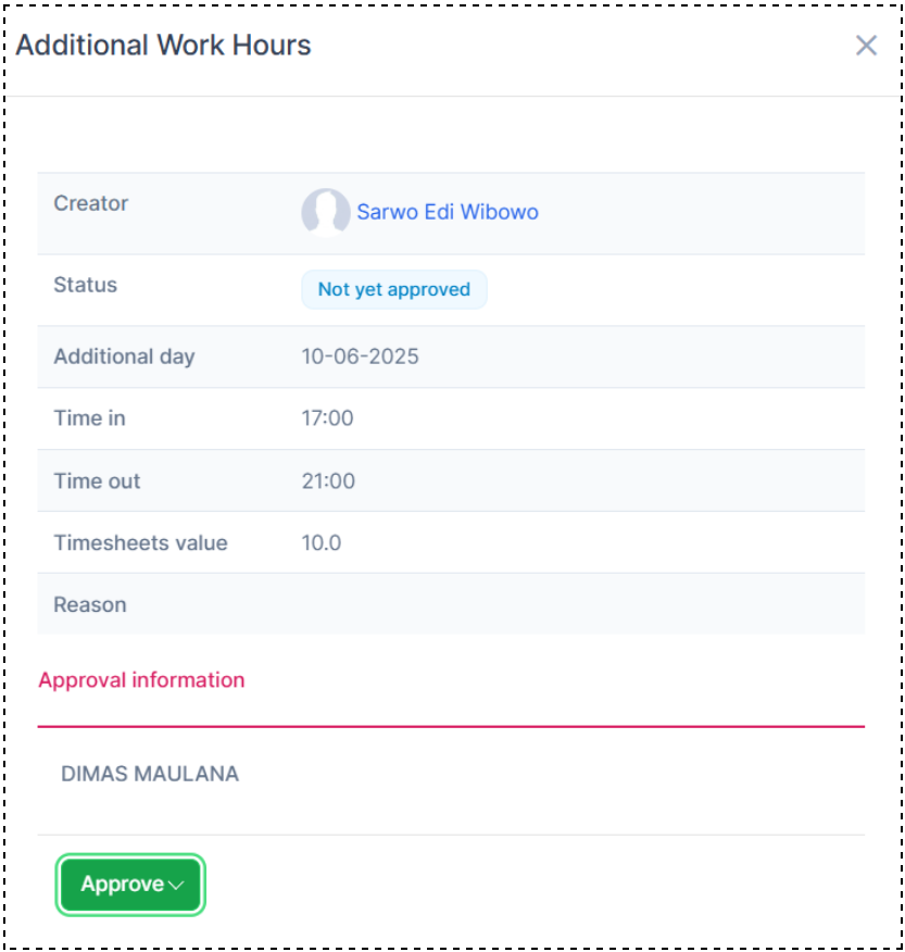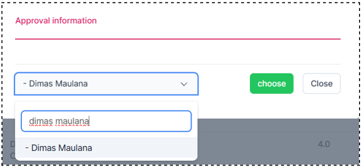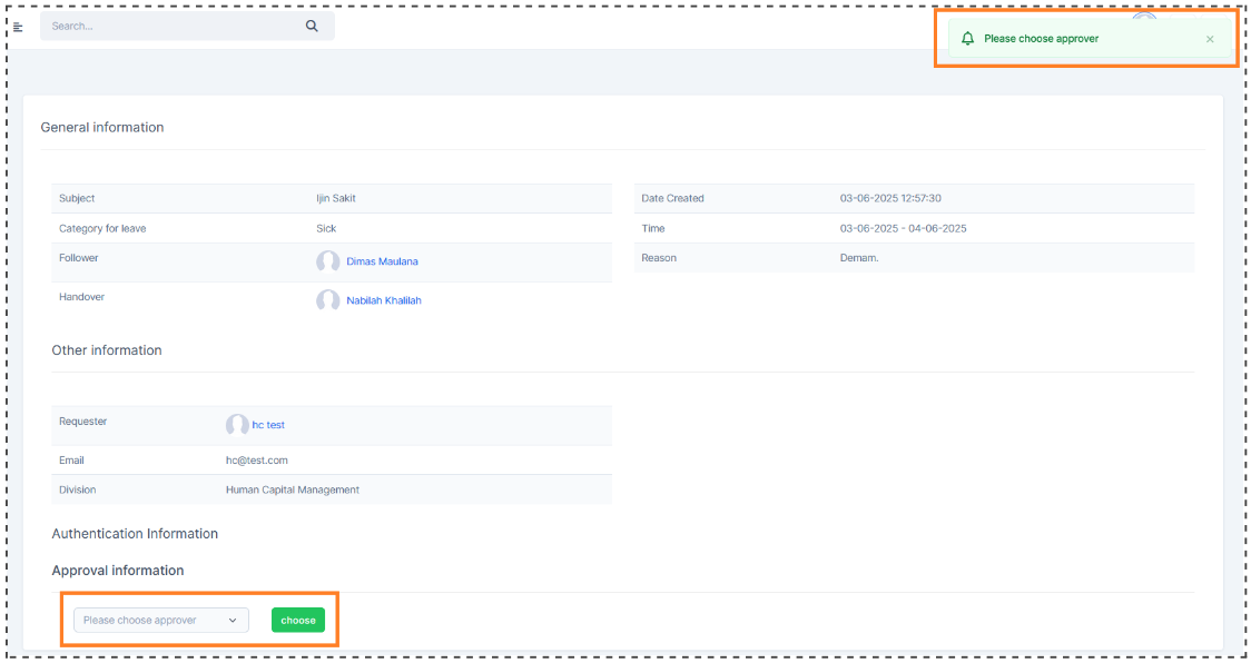 Tampilan akan berubah menjadi dropdown pilihan Approver pada Approval Information dan notifikasi Please choose approver