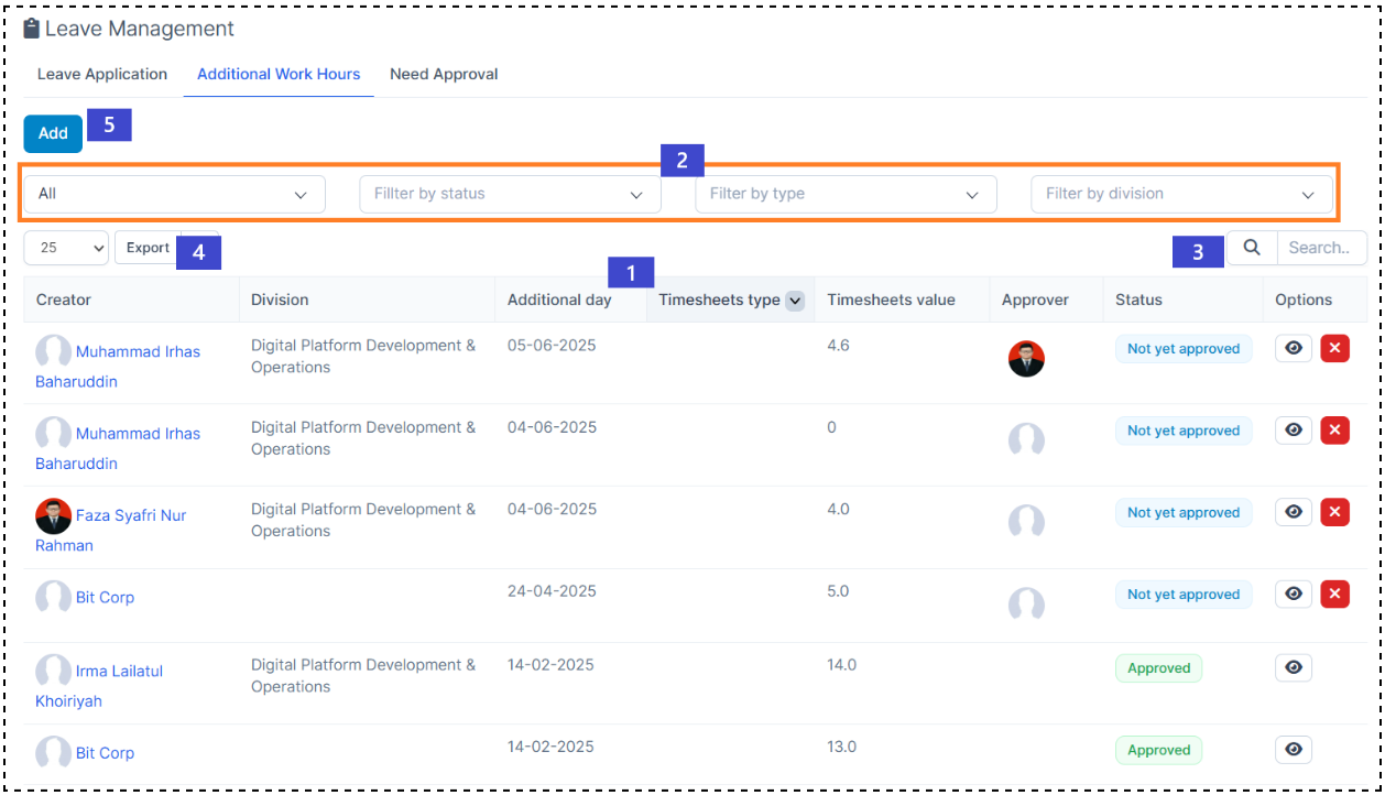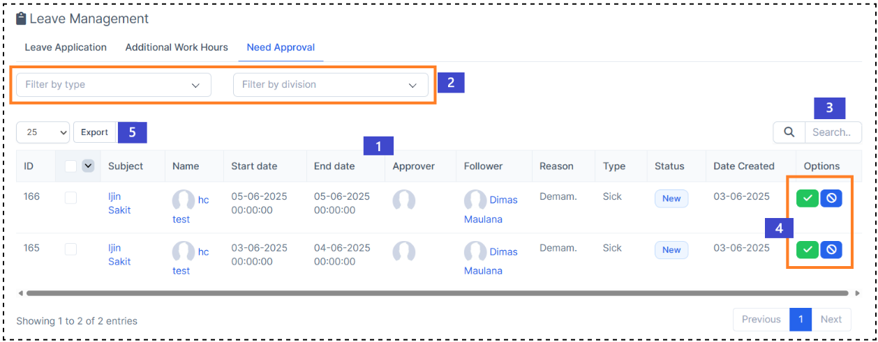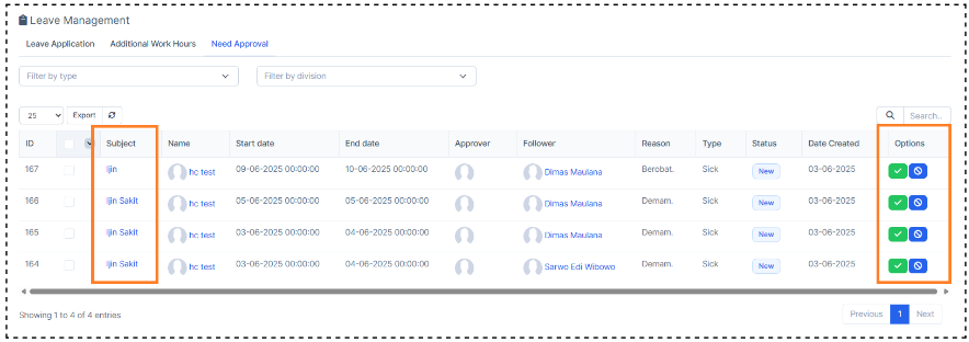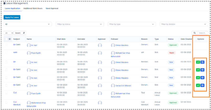 Pada kolom Option, pilih icon ✅untuk Approve cuti atau pilih icon 🚫 untuk menolak cuti