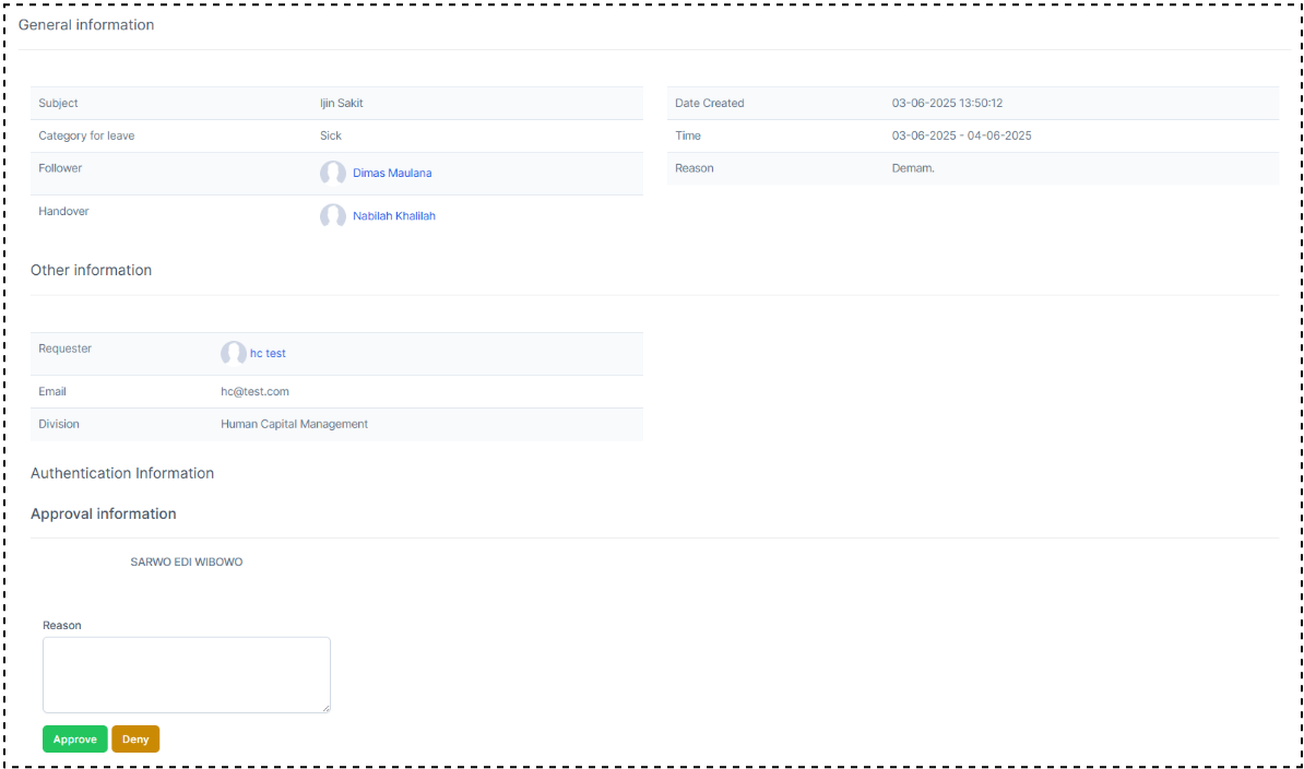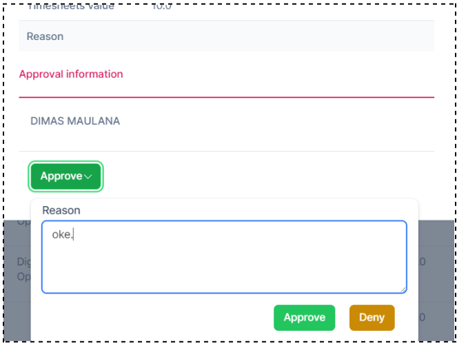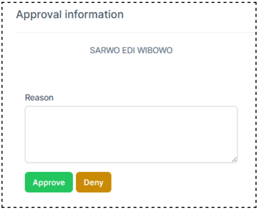 Silakan isi inputan Reason, lalu klik tombol Approve atau tombol Deny