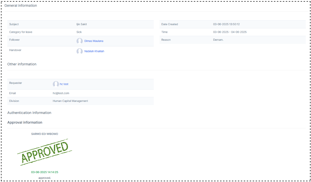 Berikut adalah contoh tampilan pengajuan cuti yang telah ditindaklanjuti: