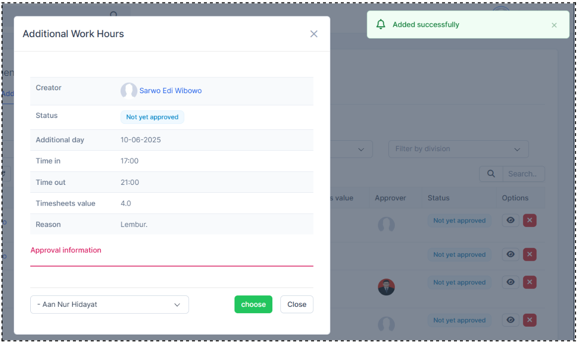 Sistem akan menampilkan notifikasi Added successfully dan form menampilkan Approval Information.
