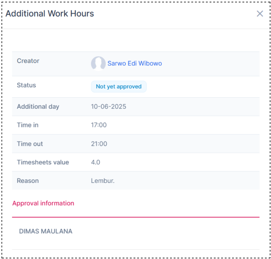 Sistem akan menampilkan pop-up pengajuan lembur, seperti contoh di bawah ini: