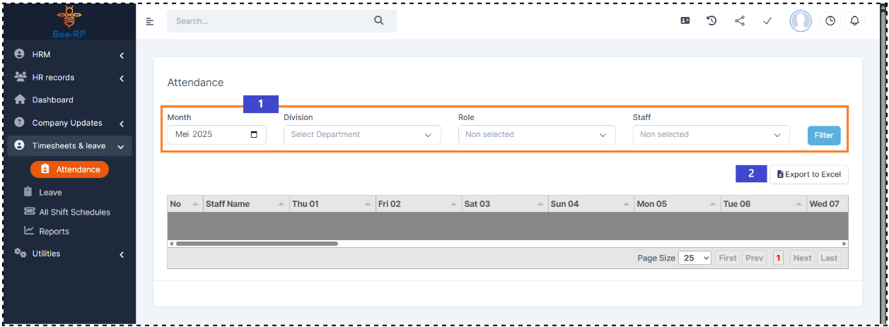 Submenu Attendance digunakan untuk monitoring kehadiran staff. Berikut adalah tampilan submenu Attendance: